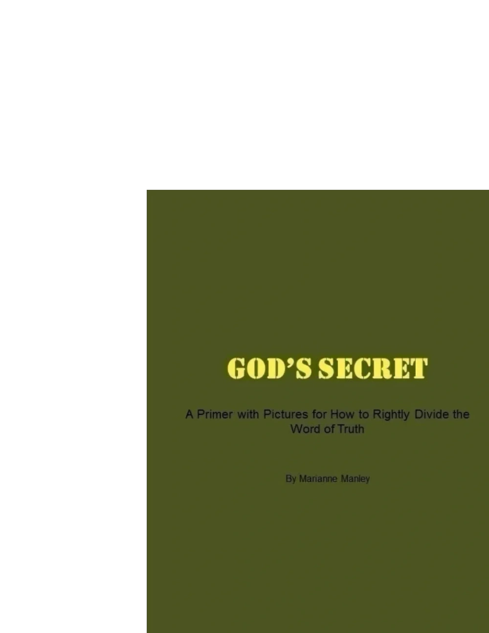 GET ALL OF MARIANNE'S BOOKS!!!!!! I have all of Marianne Manley's study books, and I recommend them all!!! Please start with God's Secret first, as it gives you an overview of God's Word.....RIGHTLY DIVIDED. That's the key here, people, to study God's Book....GOD'S WAY. I raised my two sons with this one main phrase to them "Boys, it's God's way, or NO way!" As I have learned how to study His Word, rightly dividing it God's way, I've come to love studying it all the more! I literally have had to UNTWIST 20 years of mixed up, confusing, wrong teachings...little by little.....I really meant to say...allowed the Lord to help me get wrong beliefs UNTWISTED. ITS WELL WORTH IT!!!! Marianne's books, ALL OF THEM, are absolutely wonderful, easily understood, and doctrinally sound! God bless you Marianne!!!!!